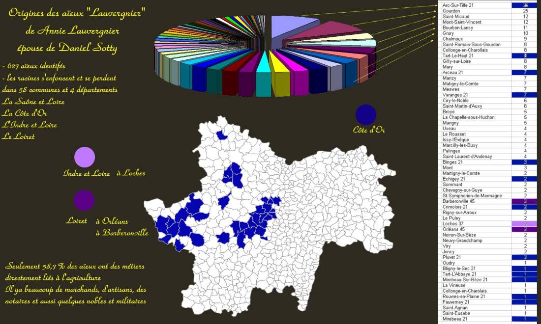 Généalogie Annie Lauvergnier branche Lauvergnier - Origines et aïeux de la branche Lauvergnier - 627 aïeux identifiés - Les racines s'enfoncent et se perdent dans 58 communes dont les 12 premières représentent plus de 50% des racines : Arc-sur-Tille 21, Gourdon 71, Saint-Micaud 71, Mont-Saint-Vincent 71 , Bourbon-Lancy 71, Grury 71, Chalmoux 71, Saint-Romain-sous-Gourdon 71, Collonges-en-Charollais 71, Tart-le-Haut 21, Gilly-sur-Loire 71 et Mary 71. Les 58 communes sont réparies sur 4 département : La Saône et Loire, La Côte d'Or, L'indre et Loire et le Loiret.