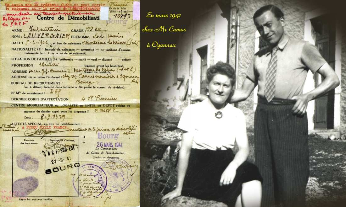 26 mars 1941, la guerre est terminée pour Louis Lauvergnier, il est démobilisé et travaille comme ébéniste en Zone Libre chez Monsieur Camus menuisier à Oyonnax.