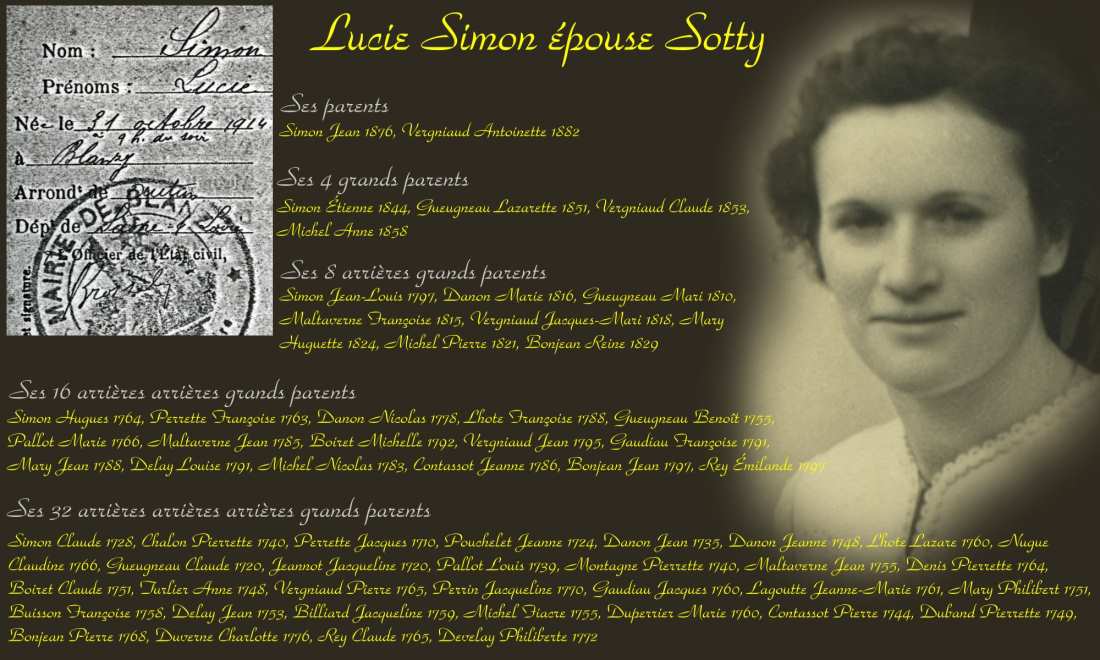 - - - Ses 32 arrières arrières grands-parents : Simon Claude 1728, Chalon Pierrette 1740, Perrette Jacques 1710, Pouchelet Jeanne 1724, Danon Jean 1735, Danon Jeanne 1748, Lhote Lazare 1760, Nugue Claudine 1766, Gueugneau Claude 1720, Jeannot Jacqueline 1720, Pallot Louis 1739, Montagne Pierrette 1740, Maltaverne Jean 1755, Denis Pierrette 1764, Boiret Claude 1751, Turlier Anne 1748, Vergniaud Pierre 1765, Perrin Jacqueline 1770, Gaudiau Jacques 1760, Lagoutte Jeanne-Marie 1761, Mary Philibert 1751, Buisson Françoise 1758, Delay Jean 1753, Billiard Jacqueline 1759, Michel Fiacre 1755, Duperrier Marie 1760, Contassot Pierre 1744, Duband Pierrette 1749, Bonjean Pierre 1768, Duverne Charlotte 1776, Rey Claude 1765, Develay Philiberte 1772