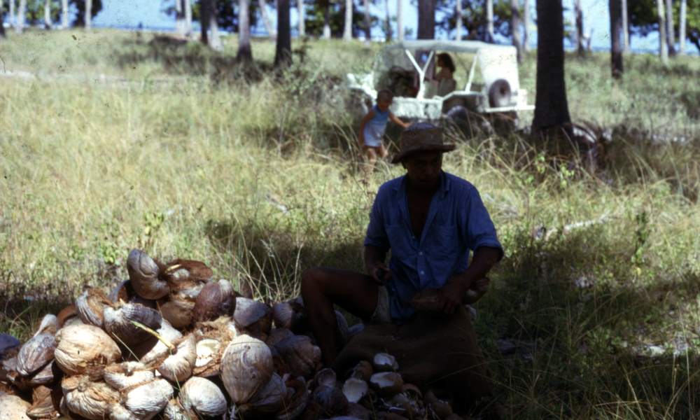 Ouverture de la noix de coco devant une installation artisanale de séchage du coprah avant la fabrication de l'huile de noix de coco